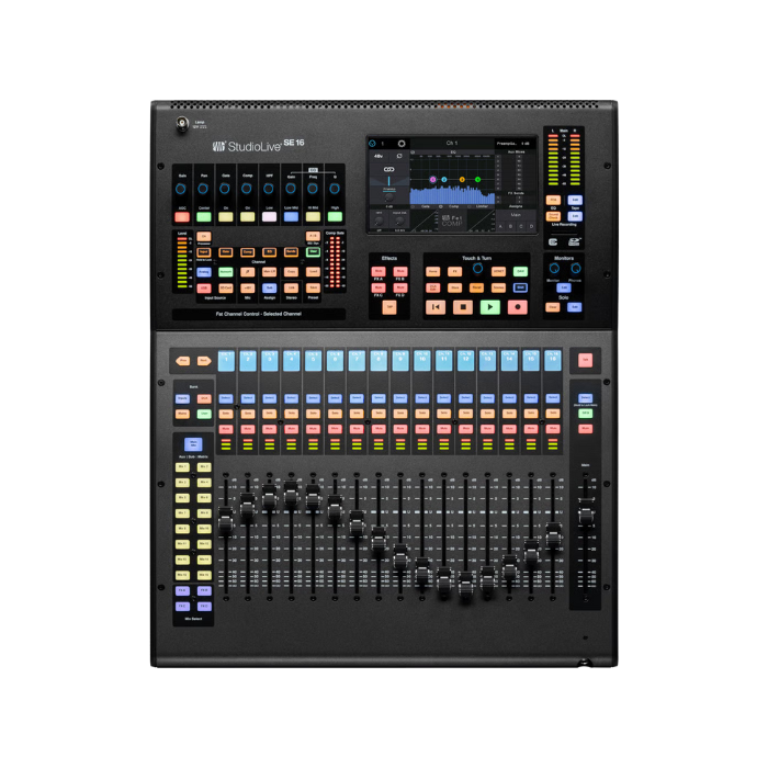 Presonus StudioLive series III SE 16 es una consola digital compacta y rackeable de 40 canales y 26 busses, con 17 faders motorizados sensibles al tacto y 16 preamplificadores XMAX clase A